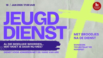 Jeugddienst met als thema: 'Al die moeilijke woorden... Wat moet je daar nu mee?' Dienst voor jongeren met Ds. Hans van Ark. Met broodjes na de dienst