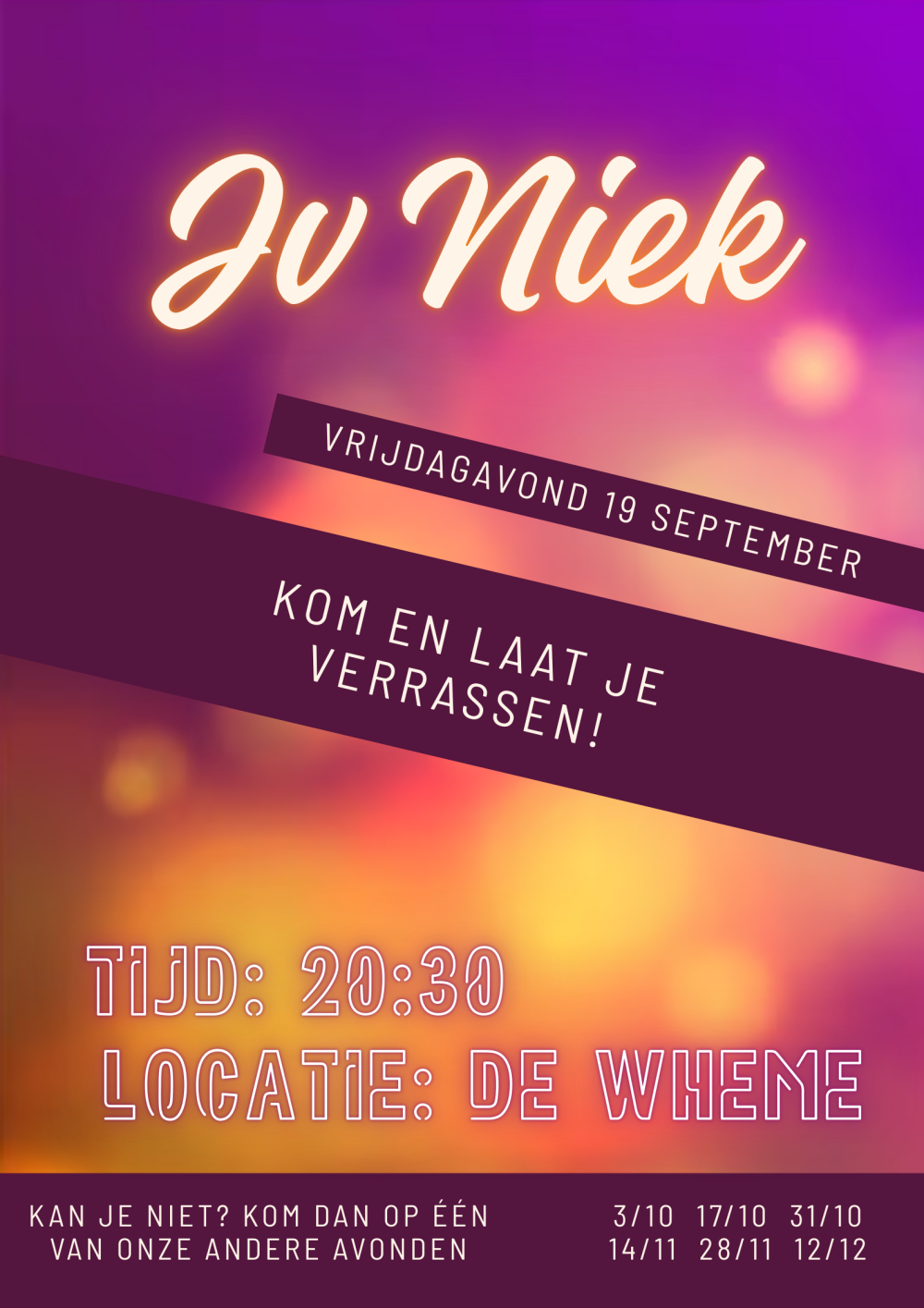 JV NIEK is een groep actieve jongeren, met leiding ;), die elkaar elke 2 weken ontmoeten. Samen met elkaar doen we leuke dingen, duiken samen de bijbel in en hebben het over onderwerpen die jullie interessant vinden. We zoeken gezamenlijk naar antwoorden op vragen die ons bezighouden, geloofsvragen maar ook actuele zaken uit de maatschappij. We staan midden in de wereld, net zoals jij. We zijn net als jij afhankelijk van Gods genade, en weten dat we het zelf niet allemaal kunnen oplossen, wel mogen we Hem erom vragen. Ben jij op zoek naar een positieve invulling van de vrijdagavond, zoek je steun in je geloofsleven van leeftijdsgenoten? Ook is er ruimte en tijd om elkaar te ontmoeten en het gezellig te maken. Kom eens aan op de vrijdagavond, je bent meer dan welkom! Ben je nog 15, en wordt je voor 1 juli 2026 16 jaar, dan nodigen we je zeker uit om langs te komen.