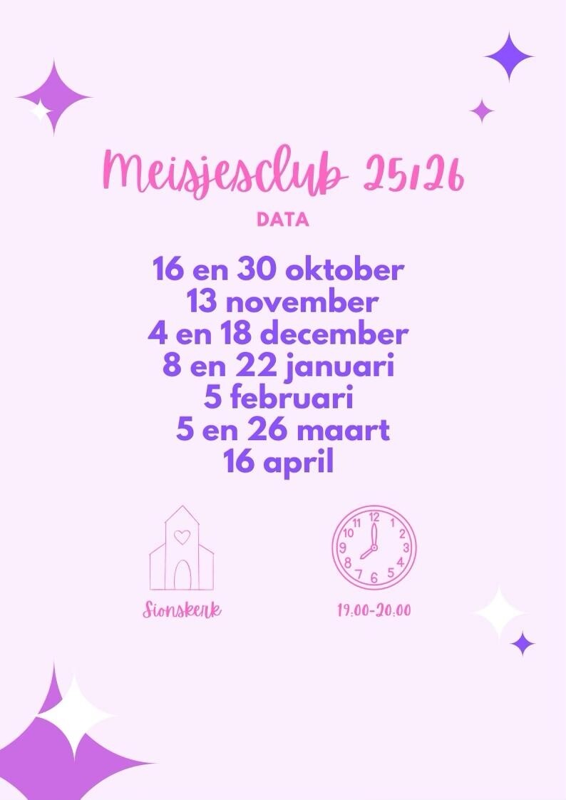 De Meisjesclub is 1 keer in de 2 weken van 19-20 uur in de Sionskerk.